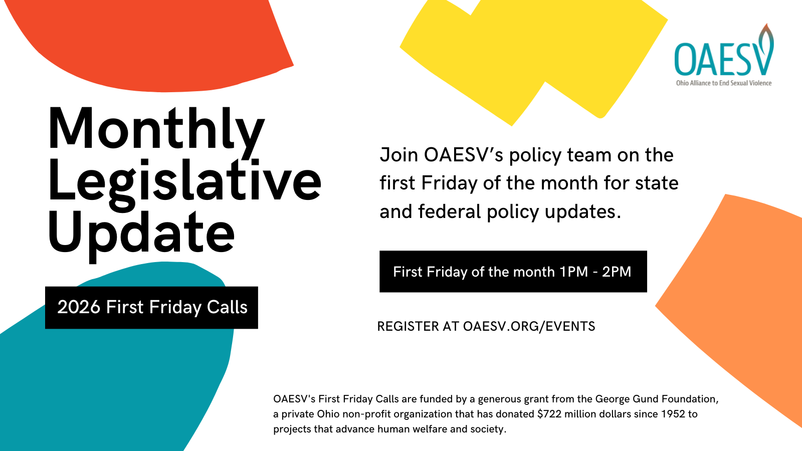 Join OAESV's First Friday calls to learn about timely legislative updates that impact Ohio survivors, rape crisis centers, and communities. In 2026, our First Friday calls will cover everything from…