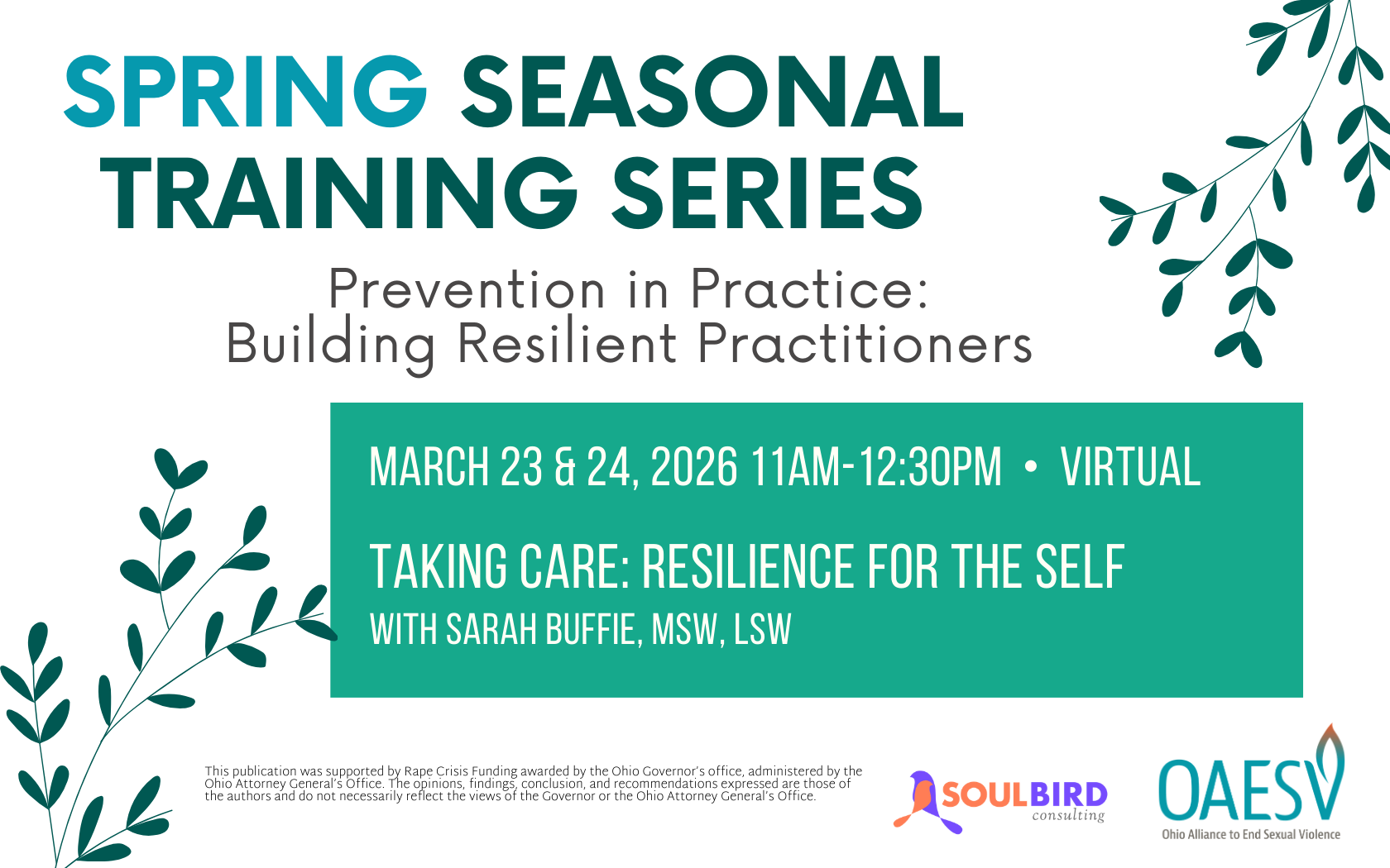 OnlineJoin us for our Spring Seasonal Training Series! Taking Care: Resilience for the Self with Sarah Buffie, MSW, LSW. Please plan to join us for both sessions on March 23…